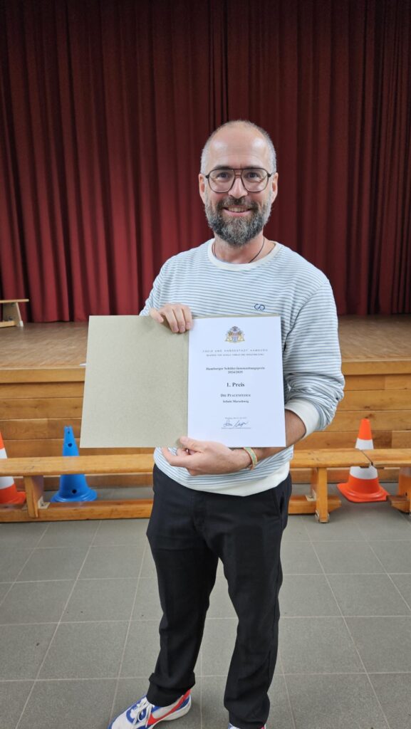 Ein weiterer Höhepunkt war die Präsentation durch die Schulleitung: Unsere Schülerzeitung Pfauenfeder hat den 1. Preis der Stadt gewonnen! Unter großem Beifall wurde die Urkunde präsentiert – ein toller Erfolg für alle beteiligten Schülerinnen und Schüler der letzten 4. Klassen.