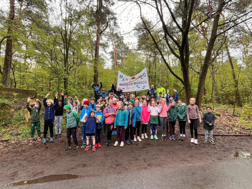 Zur Stunde werden die Trikots und die Startnummern ausgegeben. Wie auch in den vergangenen Jahren werden unsere Marschwegkinder samt ihrem Banner: Marschweg, Marsch, Marsch! trotz der jährlich größer werdenen Anzahl von teilnehmenden Schulmannschaften nicht zu übersehen sein.