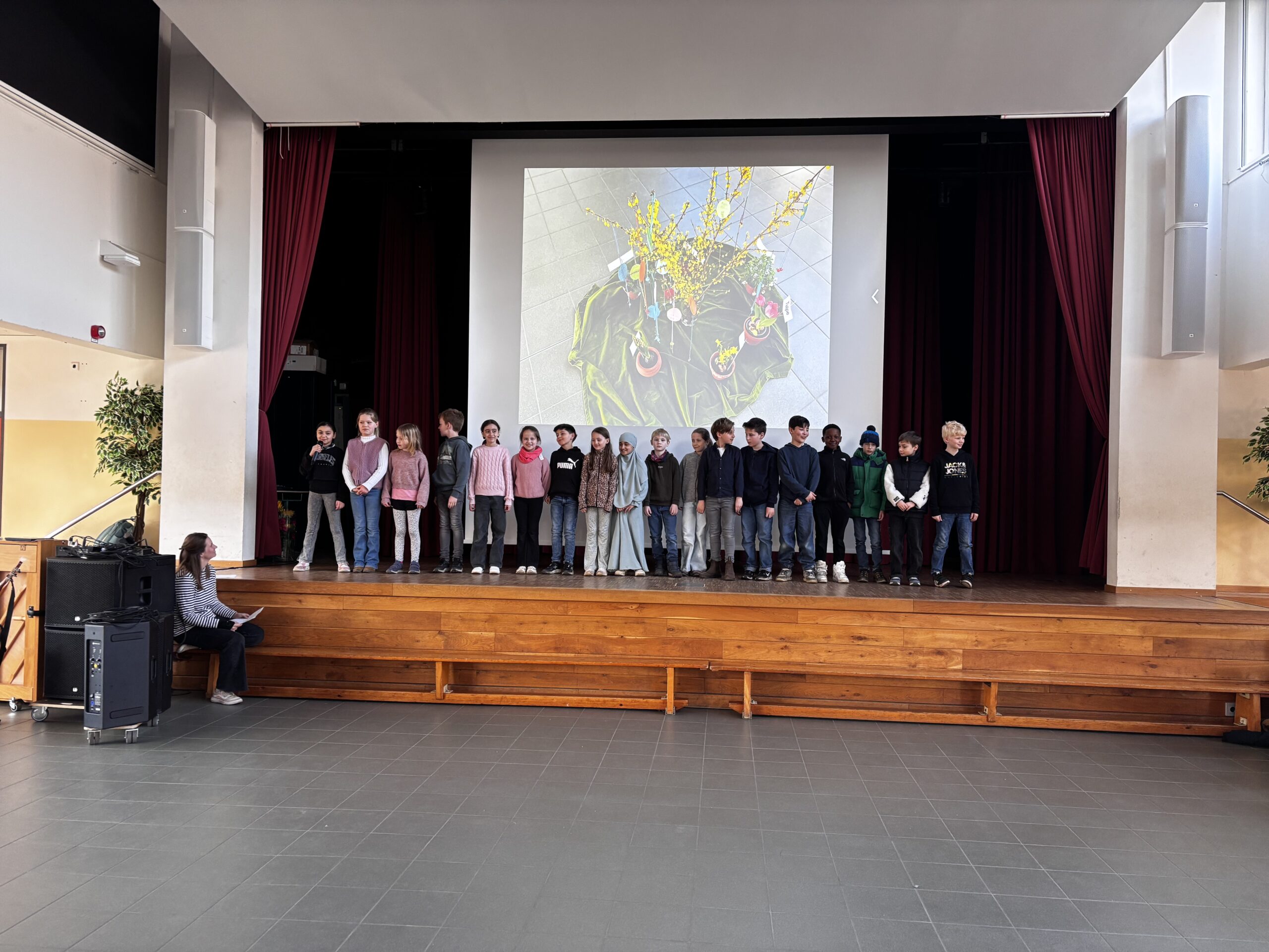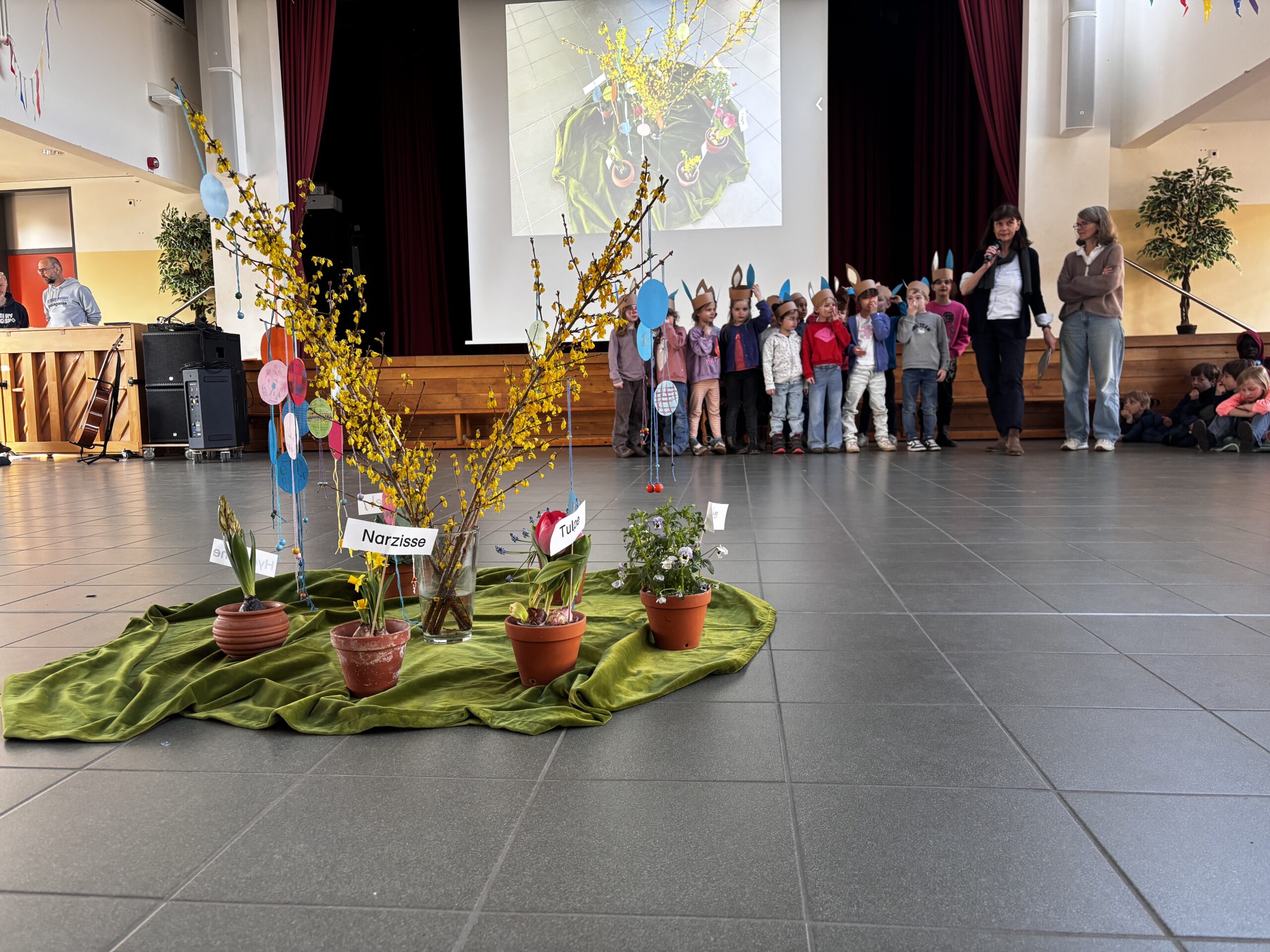 In der Aula versammelten sich kürzlich fast alle Klassen unserer Schule, um gemeinsam den Frühling zu begrüßen und sich auf das bevorstehenden Osterwochenende einzustimmen.