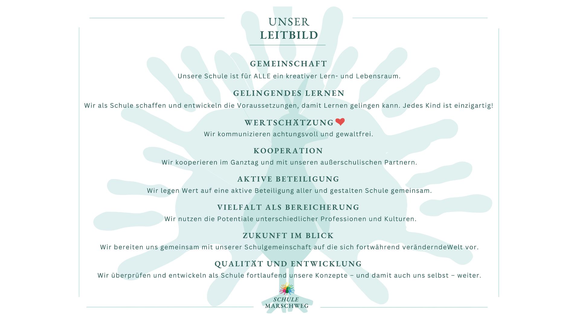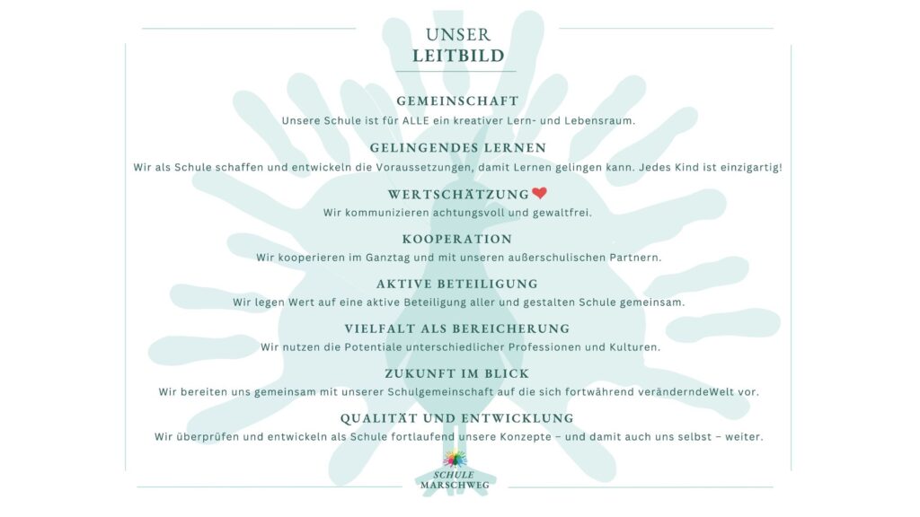 Neben der selbstverständlichen Vermittlung der Kulturtechniken Lesen, Rechnen und Schreiben wird unsere Arbeit von folgenden Gedanken geleitet: