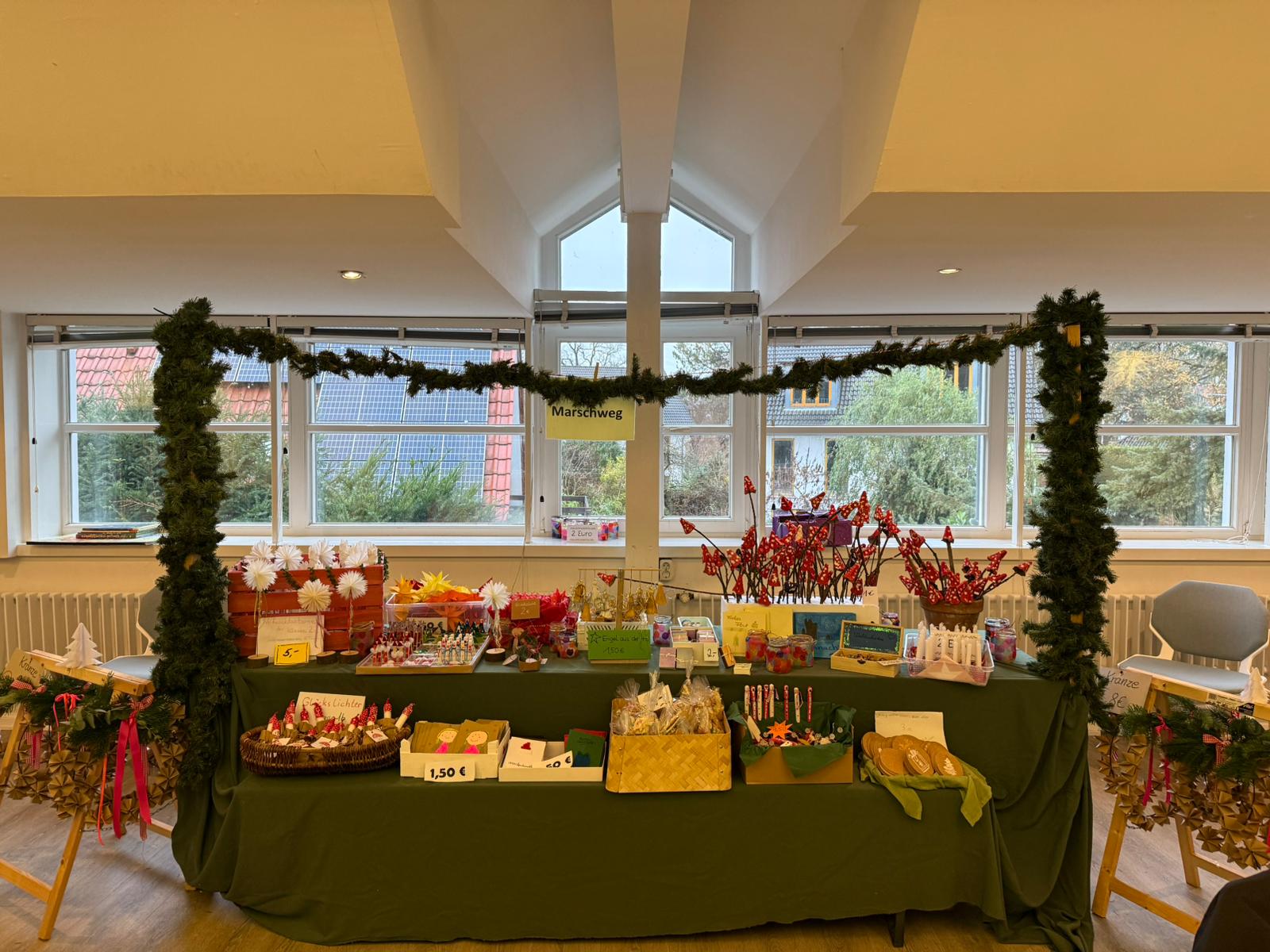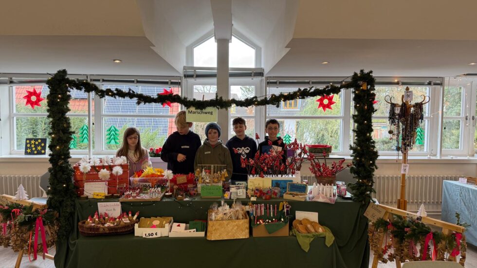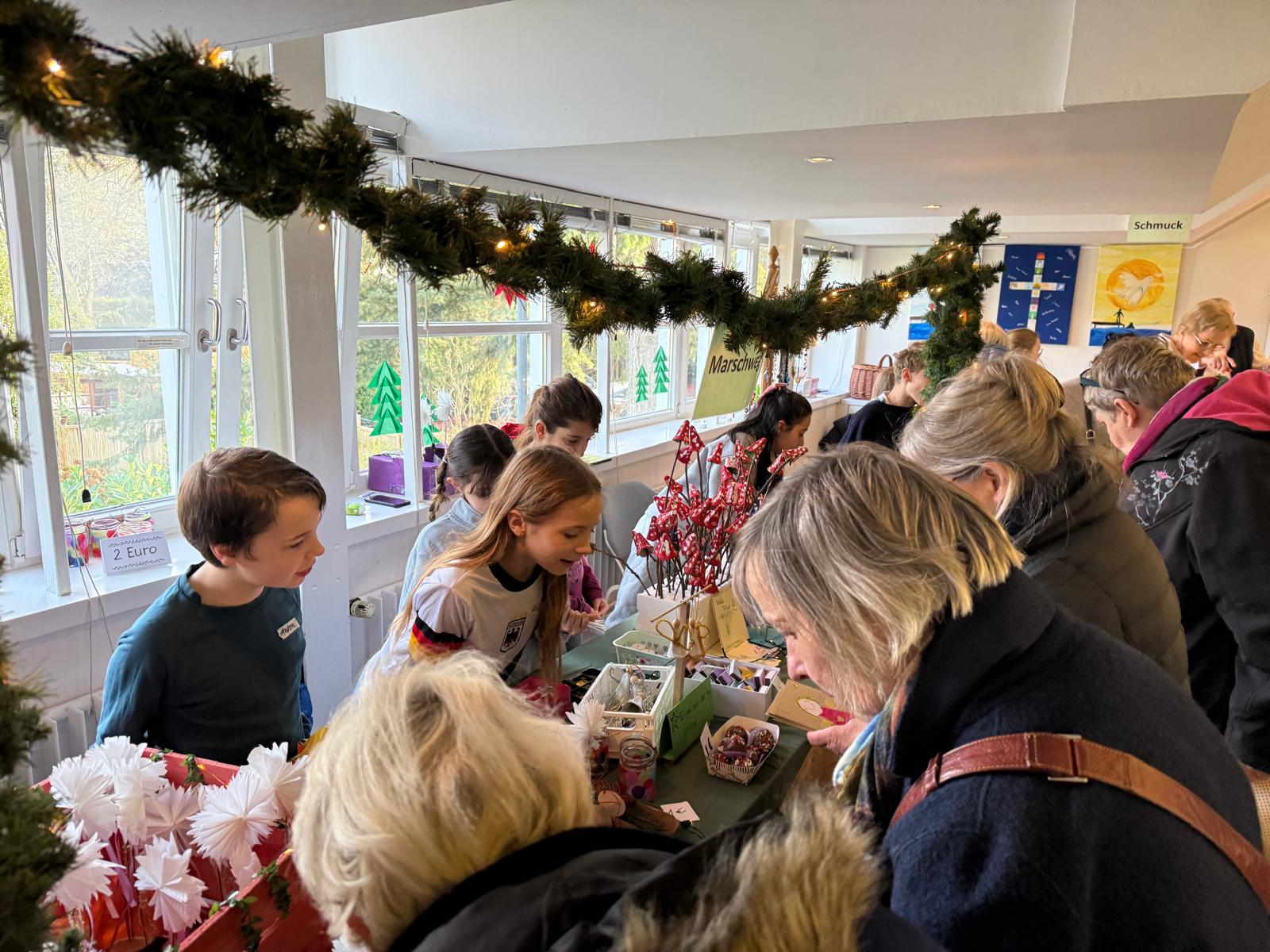 Am 1. Advent nahmen die Viertklässler unserer Grundschule auch in diesem Jahr wieder am Weihnachtsbasar der Rissener Kirchengemeinde teil. Mit großem Engagement verkauften sie dort selbstgebastelte und selbstgebackene Kleinigkeiten, die zuvor in der gesamten Schulgemeinschaft mit viel Herzblut hergestellt worden waren. In allen Klassen wurde in den Wochen davor eifrig gemalt, gefaltet, geklebt und gebacken – ein wunderbares Gemeinschaftsprojekt.